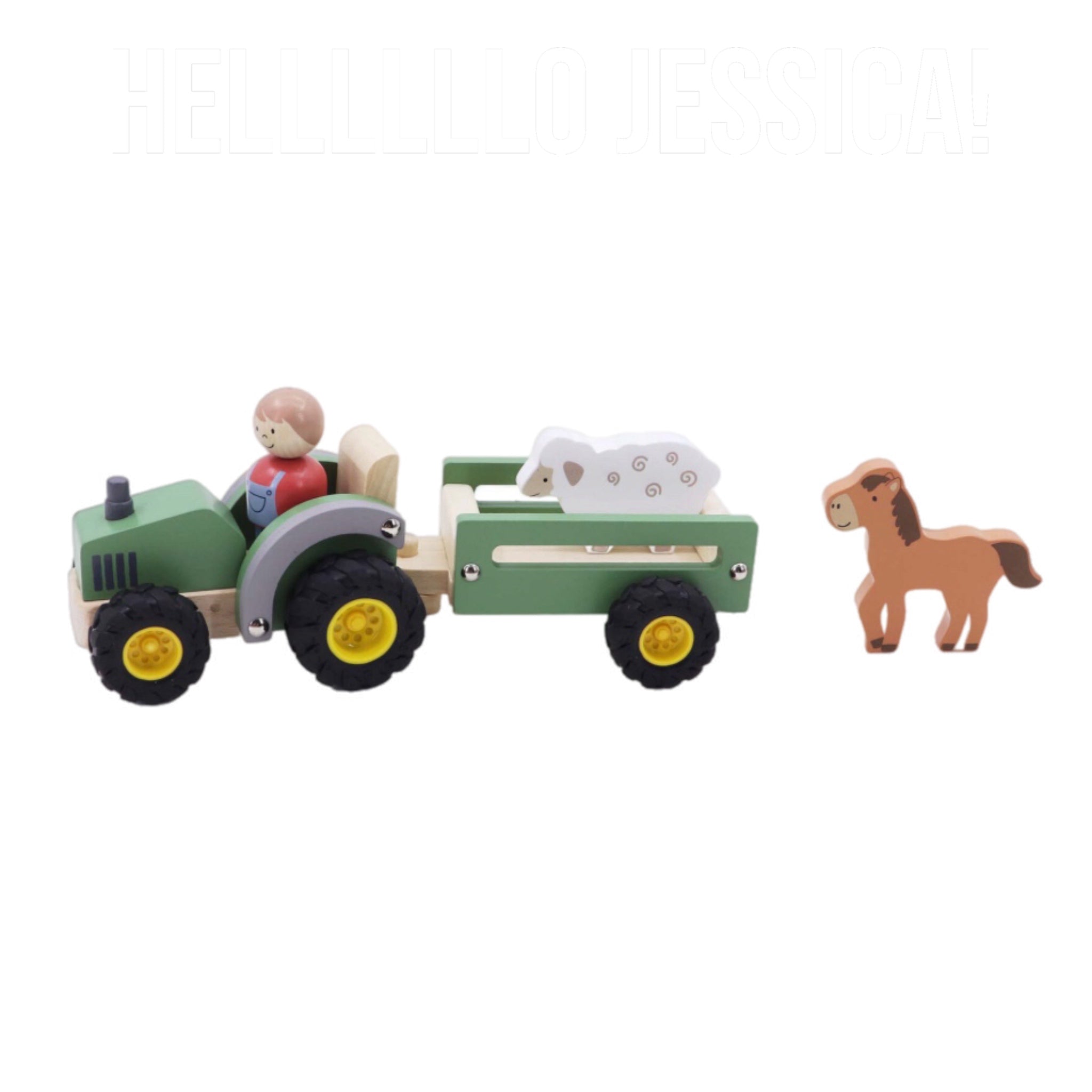All aboard the barnyard express! The Wooden Tractor with Farm Animal Green from Kaper Kidz is ready to roll into your little farmer's imagination. This charming playset includes a cheerful green tractor with a fluffy sheep and galloping horse, a delightful duo of countryside companions! The animals and tractor is lovingly crafted from sturdy wood and hand-painted with non-toxic, child-safe paints in warm, inviting tones. With wheels that spin and animals that sit snugly in their trailers, this toy encourage imaginative storytelling, roleplay, and the development of fine motor skills. A wonderful way to spark conversations about farm life, animals, and colours all while having tonnes of fun!