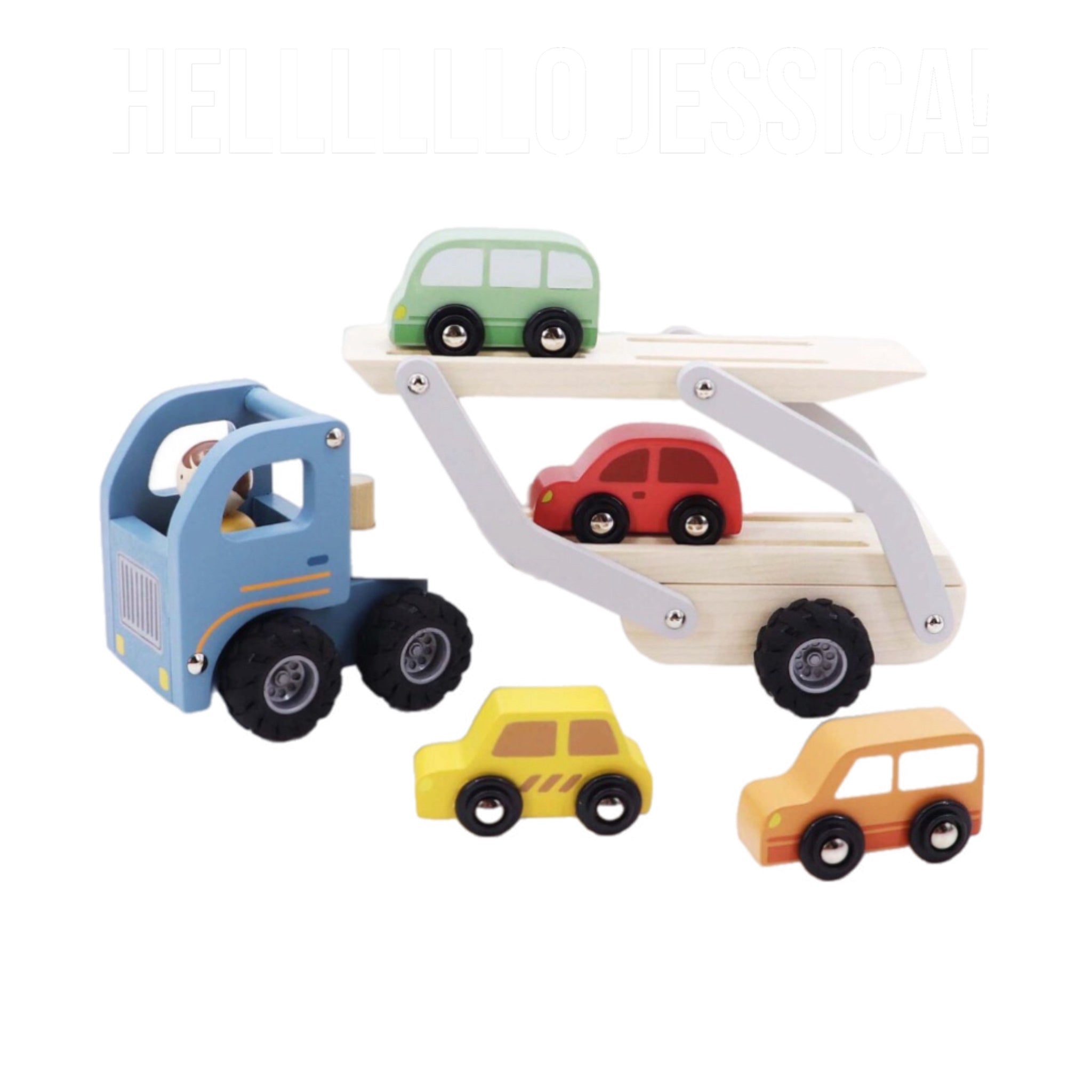 🧒 Includes: 1 wooden car carrier truck, 1 driver, and 4 wooden cars